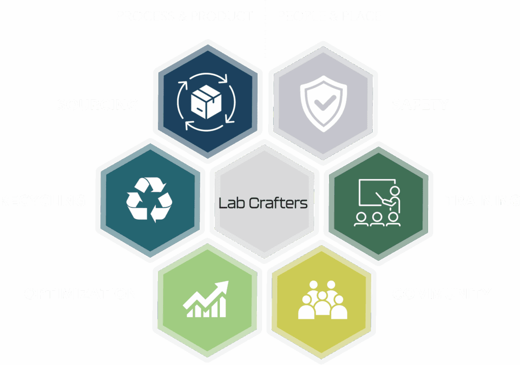 Lab Crafters prioritizes a sustainable workplace, safe and responsible manufacturing, employee well-being, and community impact. We are driving sustainable change through responsible sourcing, recycling, optimization, safety, training and community.